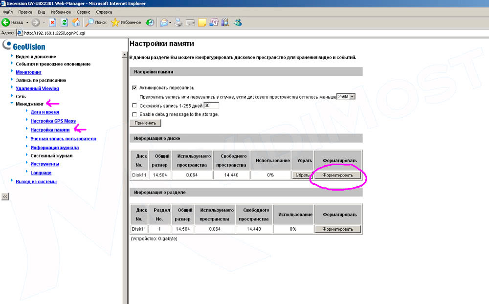 2. Перейдем во вкладку менеджмент – настройка памяти, где нужно отформотировать SD карту
