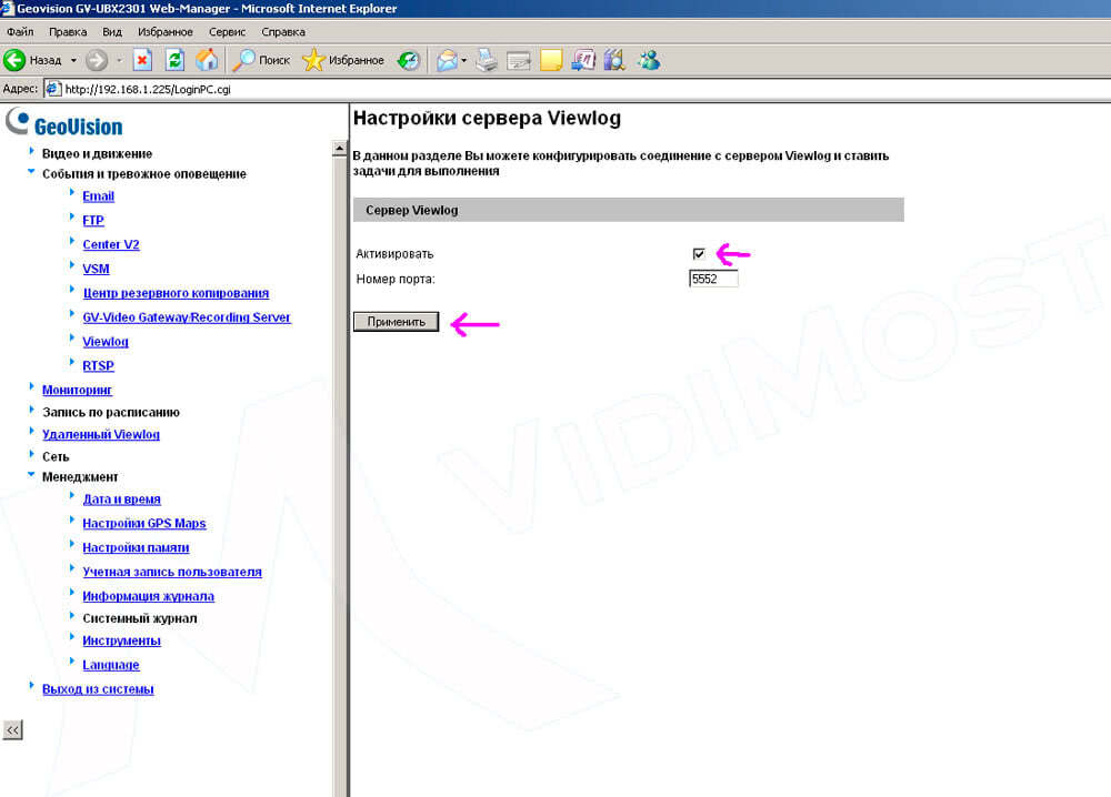 4. Чтоб настроить просмотр по сети — переходим во вкладку «события и тревожное оповещение» – viewlog – ставим галочку на «Активировать» – затем нажать применить (для удаленного просмотра архива следует пробросить порт 5552 по умолчанию на маршрутизаторе).