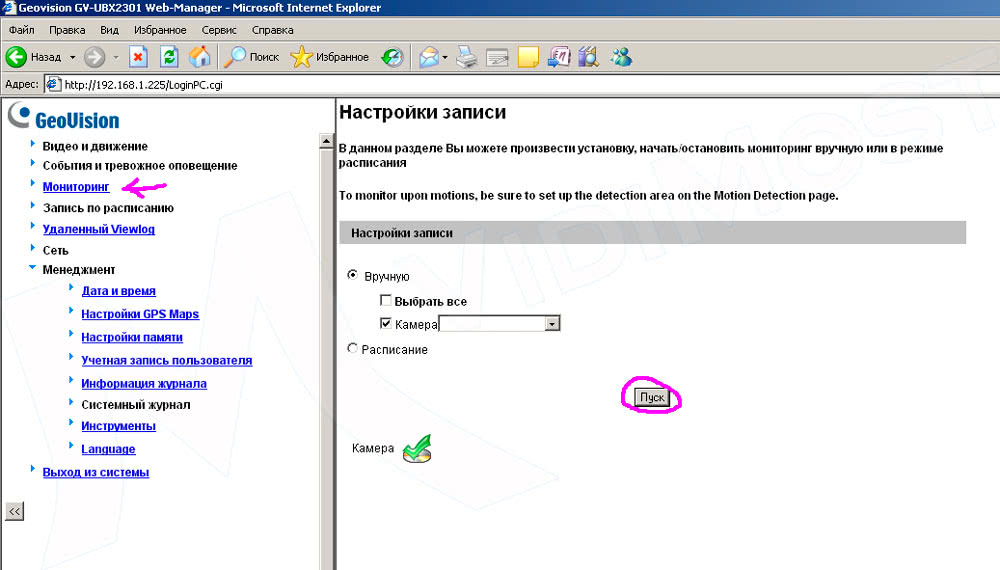 3. Далее следует перейти во вкладку Мониторинг где нужно включить запись ( здесь же нужно выбрать режим записи, постоянный, расписание или по детекции движения) нажав кнопку ПУСК