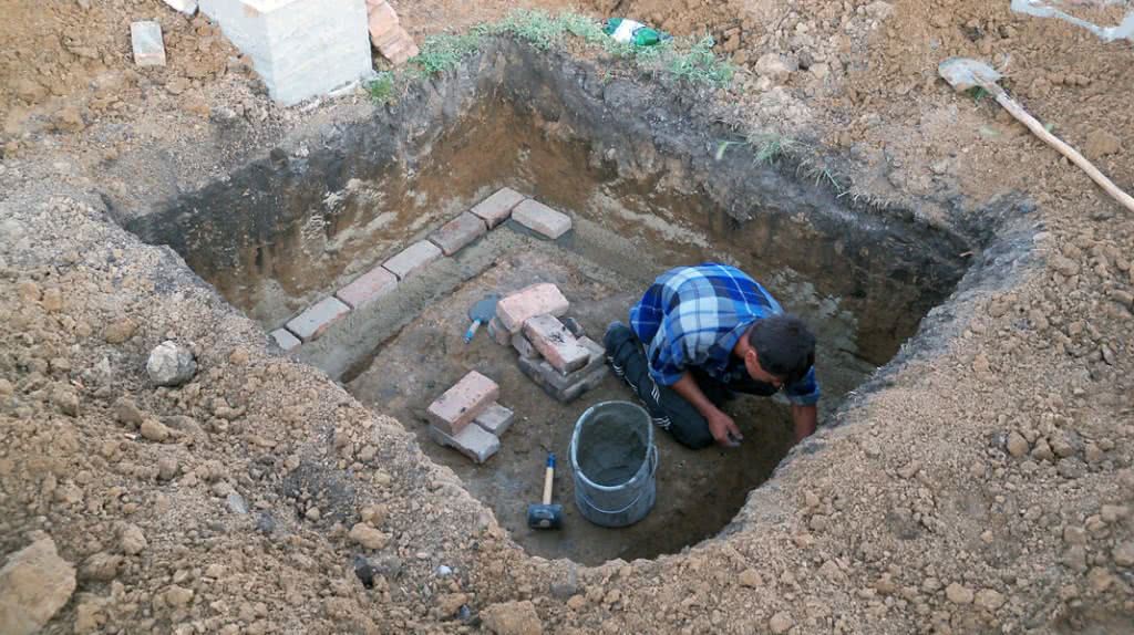 - Следует выкопать котлован такой глубины, чтобы до воды оставалась подушка из грунта в размере полуметра.
