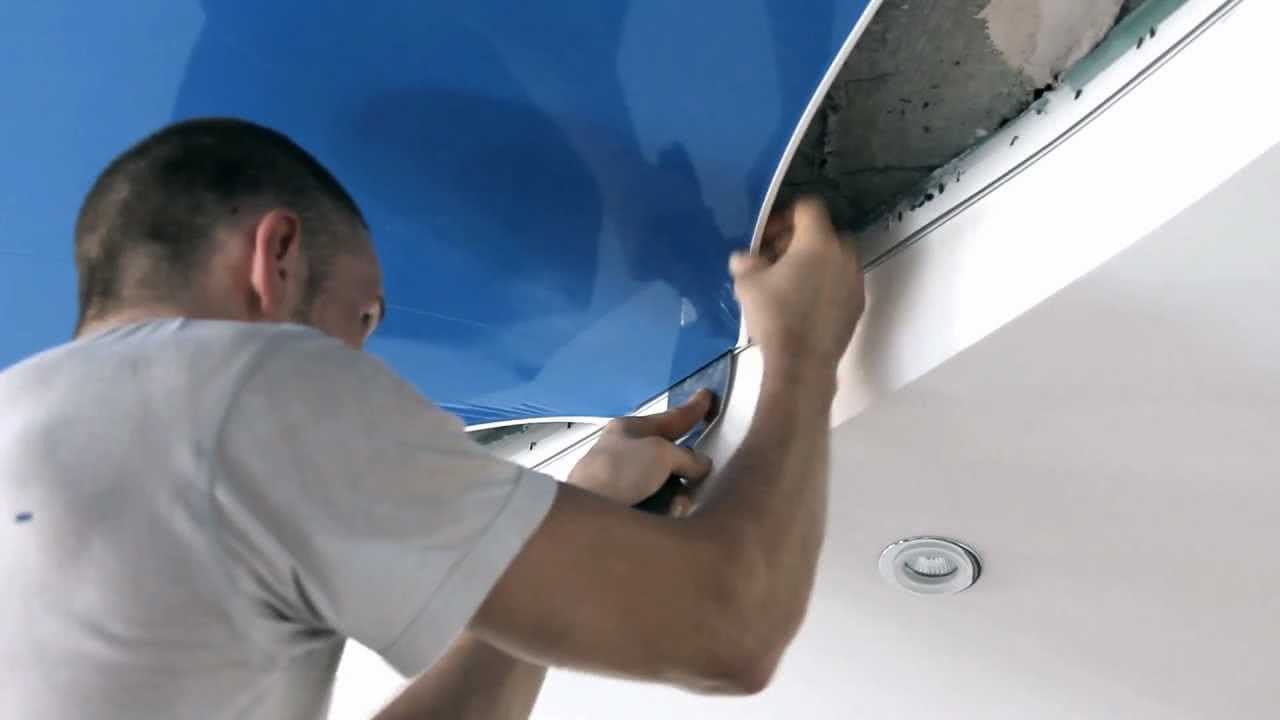 Чтобы увеличить эластичность плёнки, перед установкой её разогревают тепловой пушкой до 50°C. Полотно легче заправляется в багет, а после остывания натягивается. В результате получается ровная потолочная поверхность.