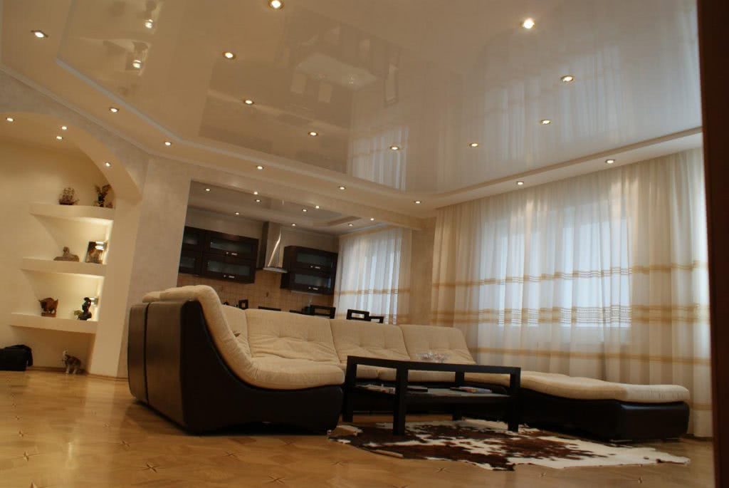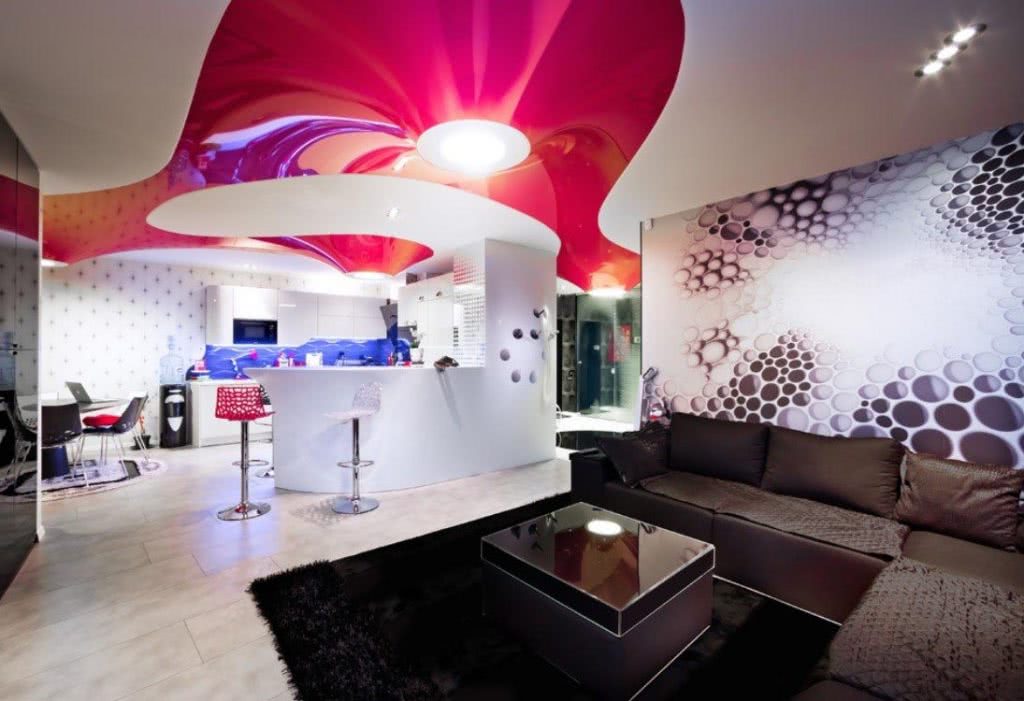 При выборе той или иной конфигурации, дизайнеры часто сравнивают фото натяжных потолков в интерьерах различных размеров и стилевых направлений.