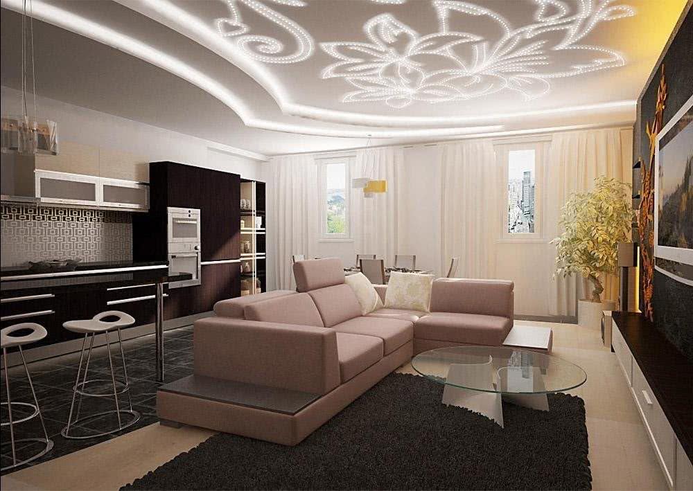 С помощью светодиодов можно создать комфортное и равномерное освещение. В ассортименте магазинов есть ленты разных оттенков, благодаря которым идеи любого дизайнера могут быть реализованы. Стоит использовать светодиоды в сочетании с большой люстрой, которая устанавливается по центру поверхности.