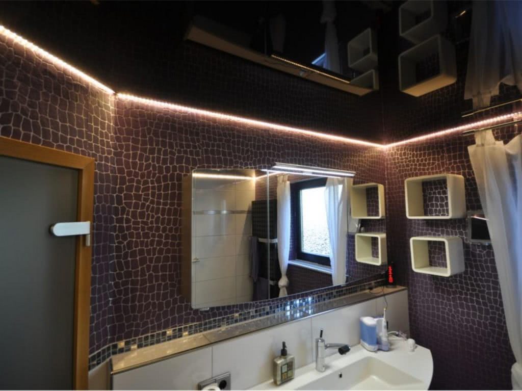 Для комнат с высокой влажностью (кухни, ванны) необходимо выбирать светодиоды, имеющие защиту от влаги. Классической вариацией считается применение белого полотна с подсветкой любого оттенка. Также дозволено использовать яркие цвета пленочного покрытия. В результате получается игра на контрастах.
