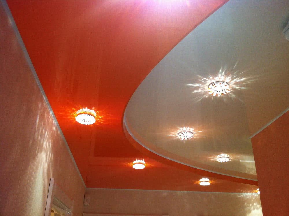 Часто натяжные потолки делают в несколько ярусов. Тогда в середине полотна все равно устанавливают крупную люстру, а на других ярусах по краям монтируют яркие светодиодные или энергосберегающие модели. Нередко, кроме основного источника, маленькие светильники устанавливают по периметру всего помещения.