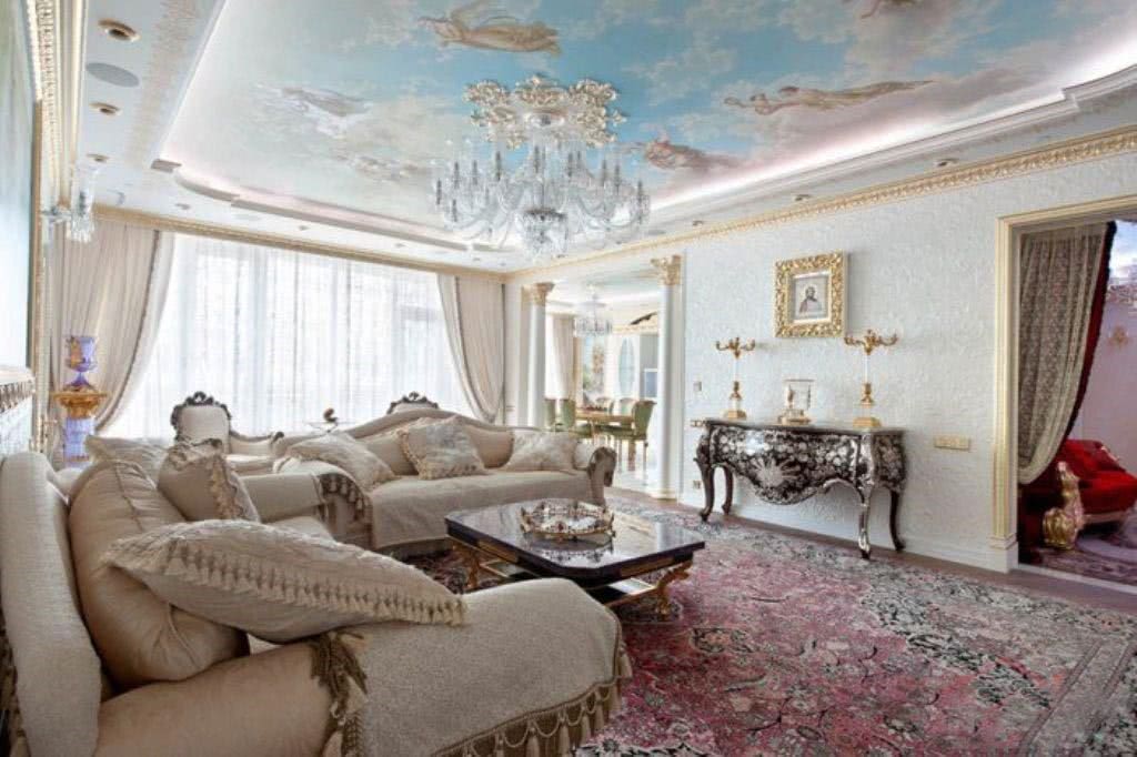 Фото рисунок потолка органично повторяет орнамент ковра на полу.