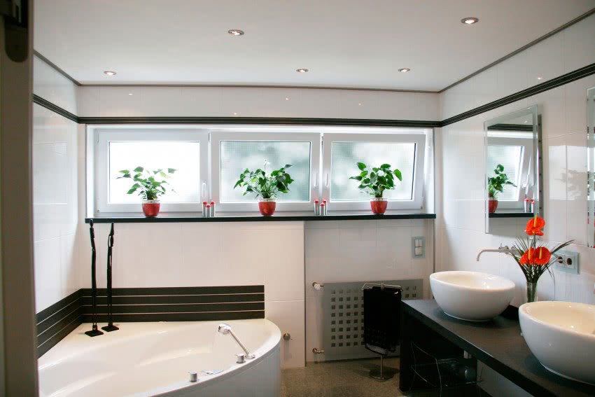Для малогабаритных комнат желательно выбирать светло-серый или белый цвет, он позволит визуально увеличить пространство. Черный же потолок отлично подойдет для высоких помещений, при этом его можно комбинировать с другими насыщенными оттенками. Если планируется использовать ванную в качестве комнаты для расслабления и релаксации, то дизайнеры советуют отдавать предпочтение синему, голубому и зеленому цвету.