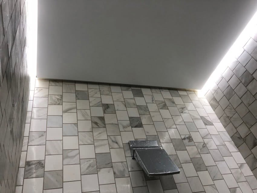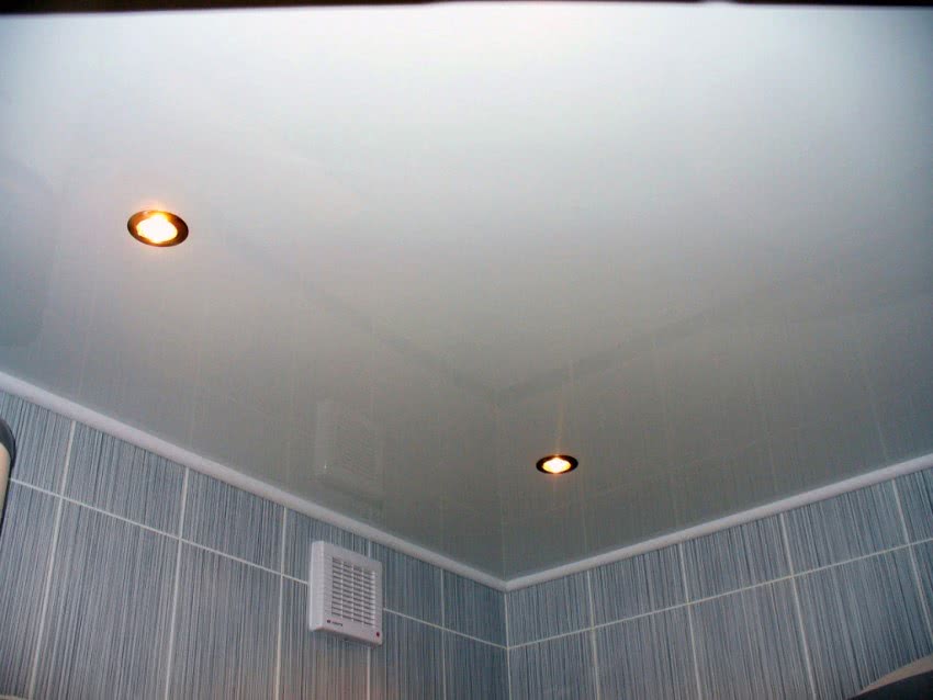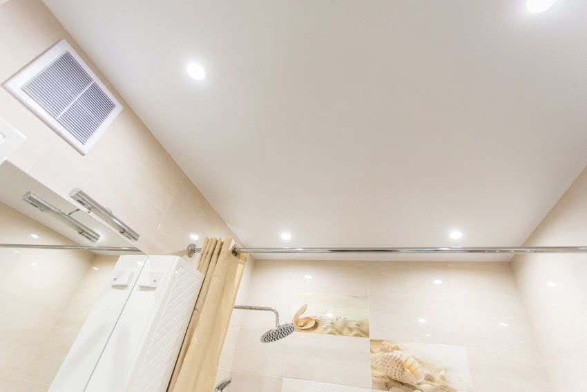 Именно поэтому натяжные полотна не только можно, но и нужно монтировать в ванной. Однако есть один нюанс, который нужно учитывать при выборе этого варианта отделки. Пленка очень герметичная и не пропускает воздух, поэтому пространство за натяжной поверхностью плохо вентилируется. Из-за этого там скапливается конденсат, который может привести к появлению плесени. Но эта проблема легко решается установкой вентиляционных решеток.