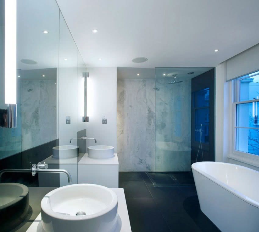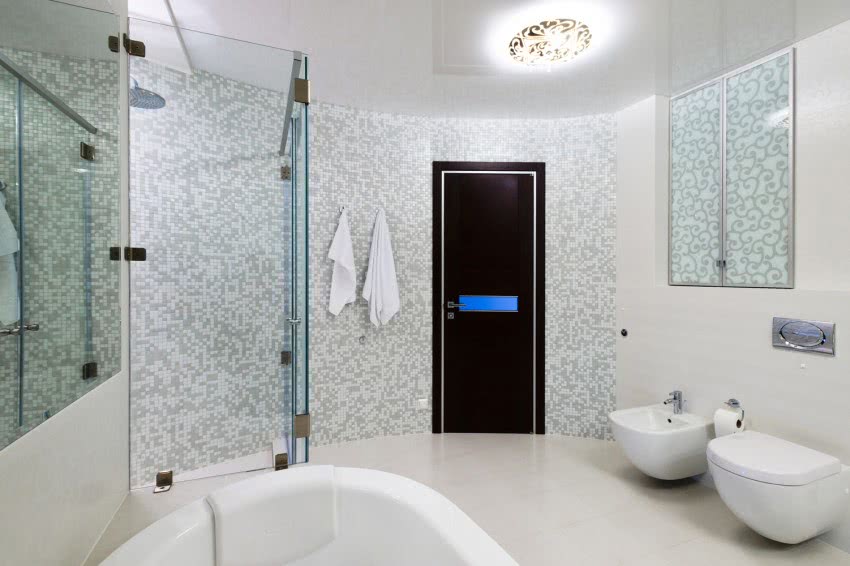 При выборе дизайна потолка важно учитывать и его цвет, который должен гармонично вписываться в общее оформление ванной. Помимо этого, нужно знать, какую роль будет играть конструкция в интерьере: выступать основным фоном или же дополнительным элементом декора