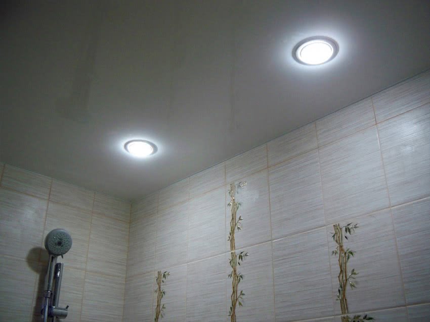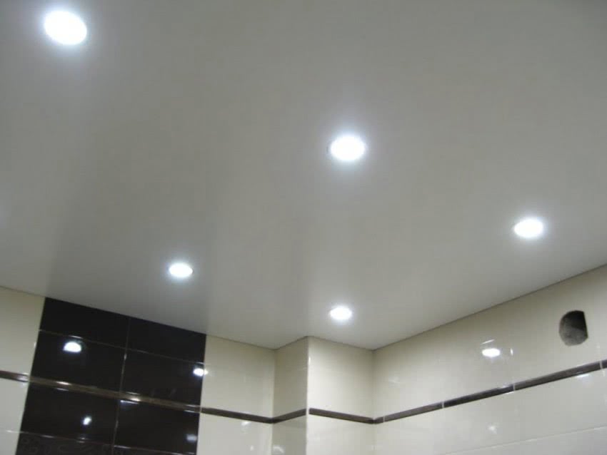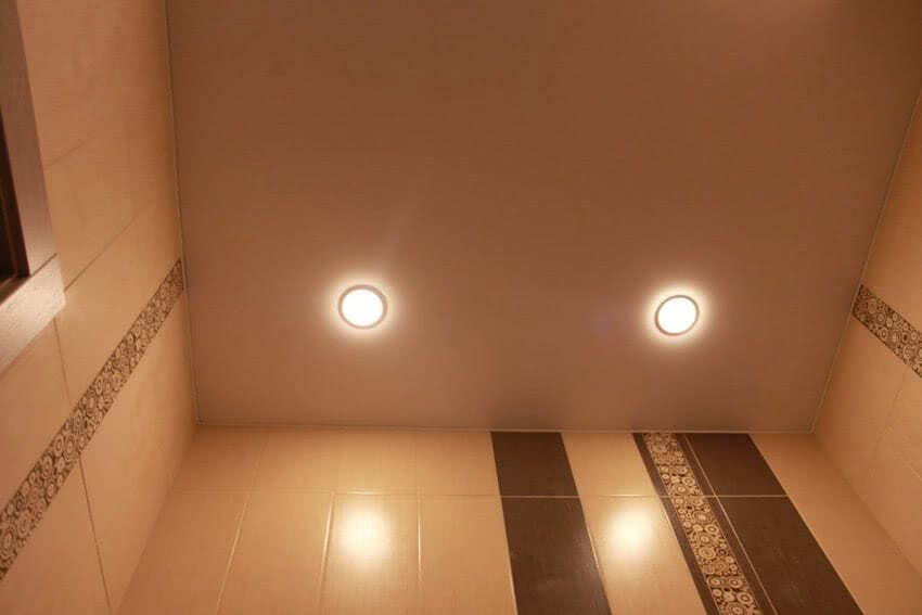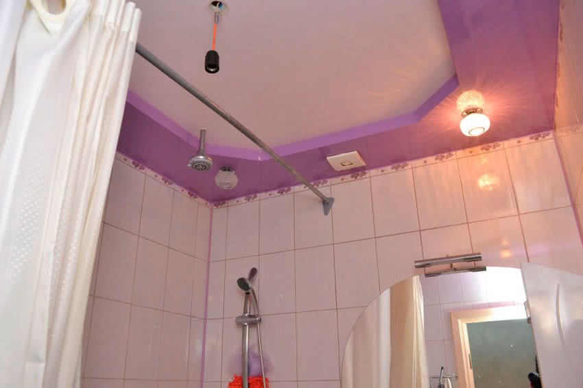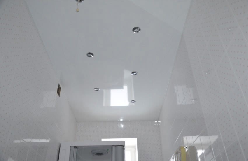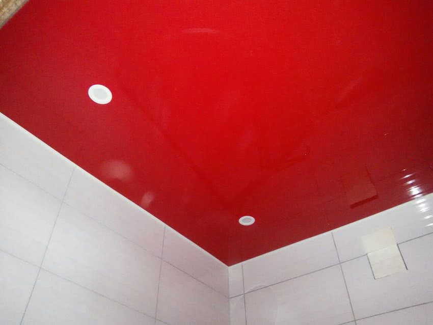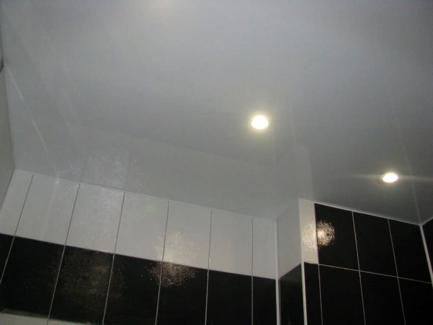 Дополнительным преимуществом является то, что глянцевое светлое покрытие зрительно расширяет пространство ванной и делает помещение выше. Такой потолок скрывает все дефекты базовой поверхности и инженерные коммуникации. Кроме этого, основание не нуждается в подготовке перед монтажом ПВХ пленки. Покрытие уменьшает высоту помещения минимум на 2-3 см при отсутствии встроенных светильников.