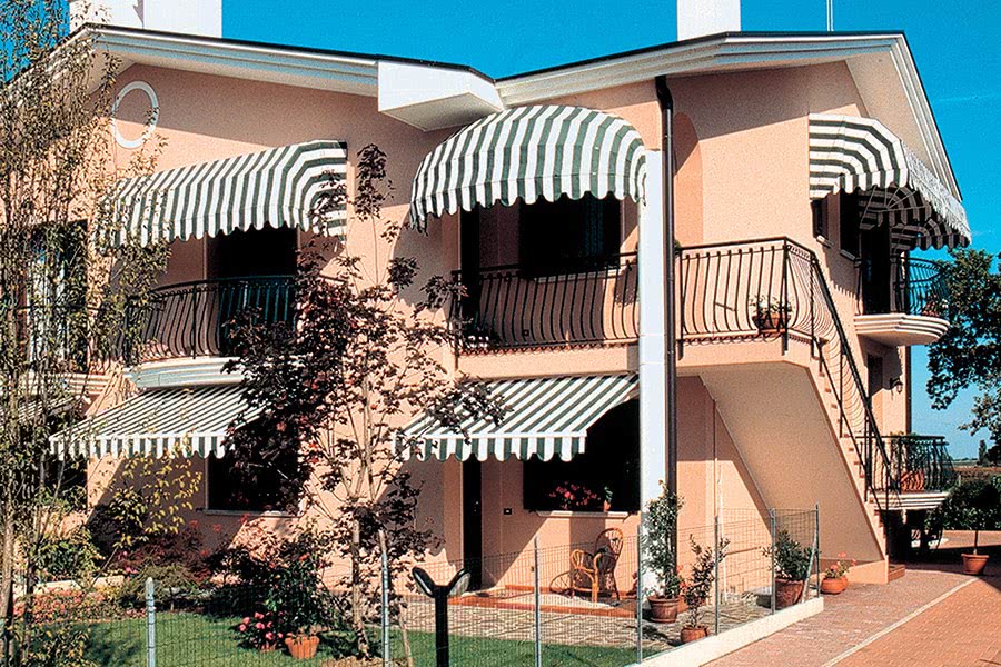 Маркизы «корзинного» типа выпускаются в 4-угольном формате и в виде купола. Они отлично смотрятся над дверями и окнами арочной формы, служат стильным украшением фасада.