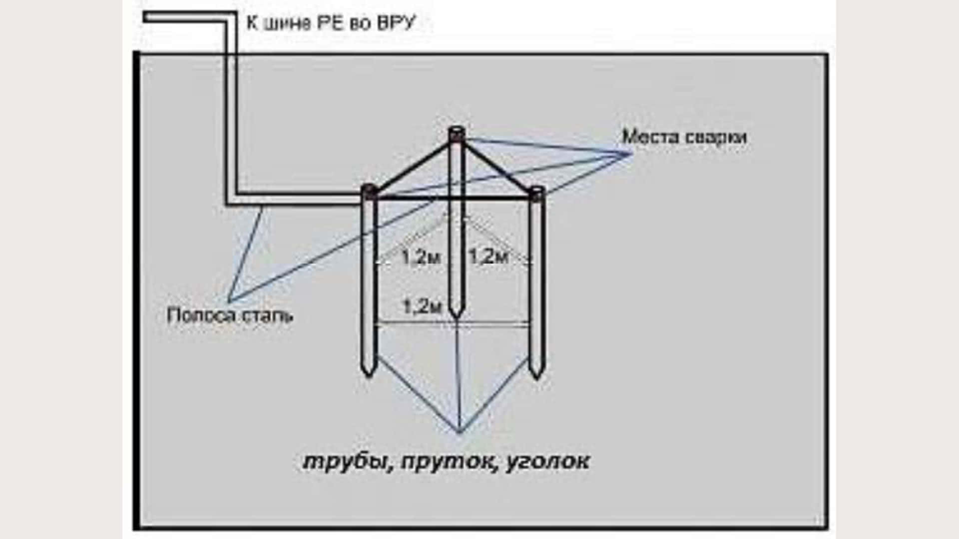 В таком виде контура используется три штыря, которые сварены с помощью полос в треугольник с равными сторонами. Между электродами длина выбирается в зависимости от длины заглубления электрода до двух таких глубин. Т.е. для длины электрода (заглубление) 2м, сторона треугольника будет 2-4м.