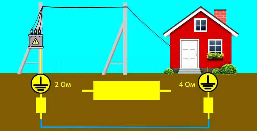 Теперь перейдем непосредственно к рассмотрению темы заземления на примере частного дома имеющего заземление электрооборудования по системе TT. От распределительного трансформатора по столбам к каждому дому заходит однофазное питание 220 Вольт — фаза и нейтраль (рабочий нулевой провод). Помимо того, что нейтраль имеет нулевой потенциал, на распределительной подстанции она соединена через контур заземления с контуром заземления нашего дома. Объясним это простыми словами. Мы знаем, что земля это проводник, но не идеальный. В зависимости от грунта удельные сопротивления могут отличатся: