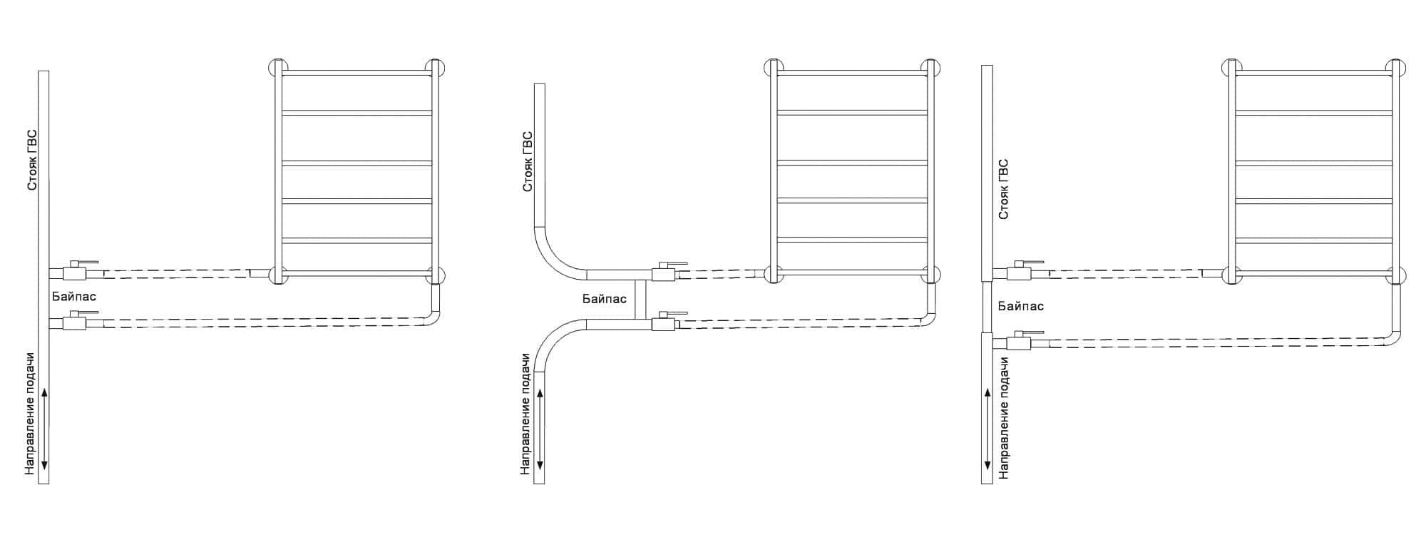 Работа полотенцесушителей с нижней подводкой очень сильно зависит от давления и направления подачи теплоносителя, поэтому используется несколько схем подключения — с прямым, смещённым или зауженным байпасом