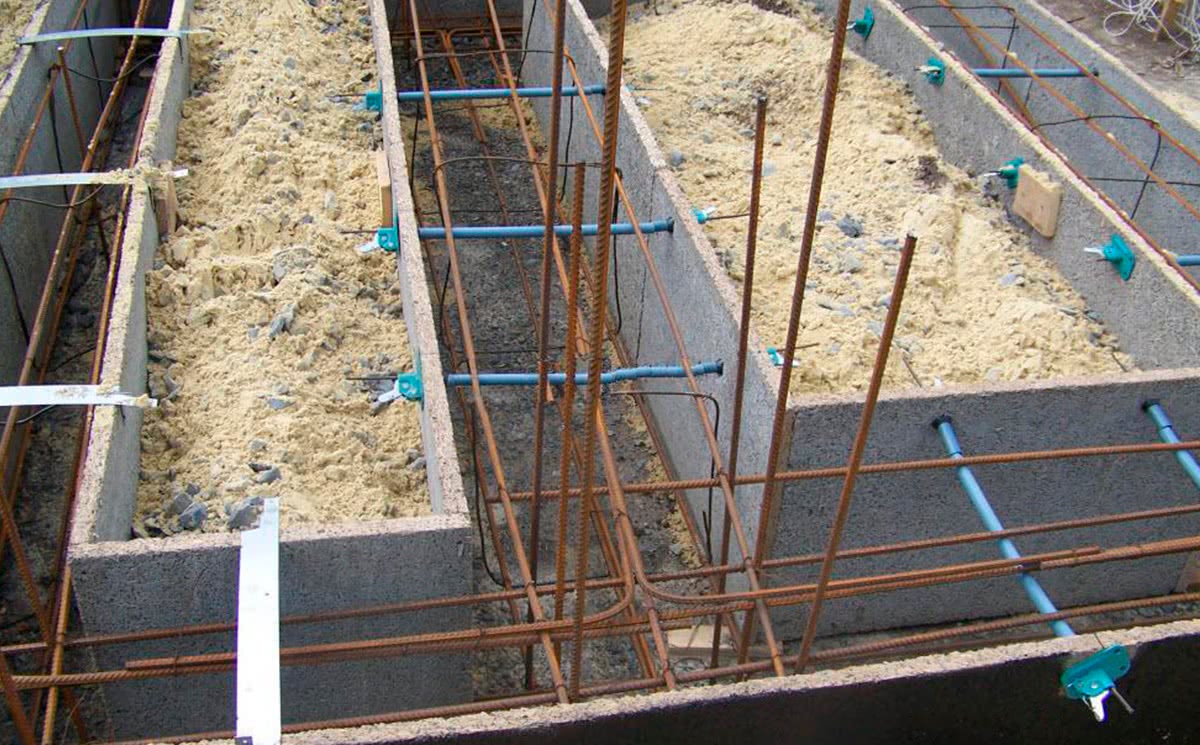 - В некоторых видах блока уже имеется армокаркас, который в процессе заливки только дополняют вертикальными стержнями. Следовательно, армирование фундамента получается менее затратным.