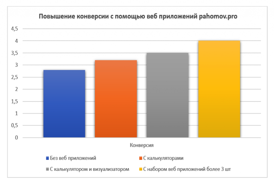 Согласно замерам Pahomov.pro, увеличение конверсии за счет внедрения цифровых инструментов на сайте составляет от 15% (конверсия после внедрения поднимается до 3,2%) для простых решений – калькуляторов и до 45% (конверсия повышается до 4–4,1%), в случае внедрения более сложных инновационных сервисов, например, визуализации по фото клиента, дополненной реальности.