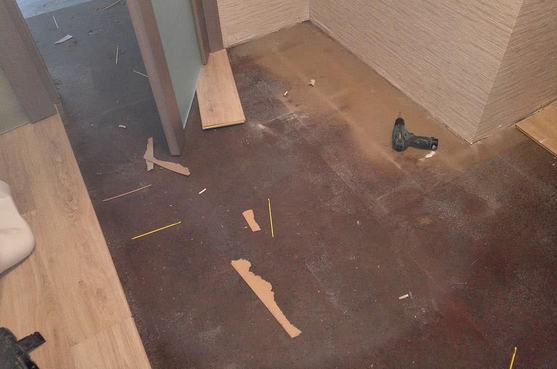 Приехав на адрес, осуществили демонтаж ламината и хвойной подложки спустя неделю после потопа. Подкладка сгнила и покрылась грибком, даже бетонное основание почернело. Пришлось перед настилом ламината просушивать бетонную стяжку около недели.