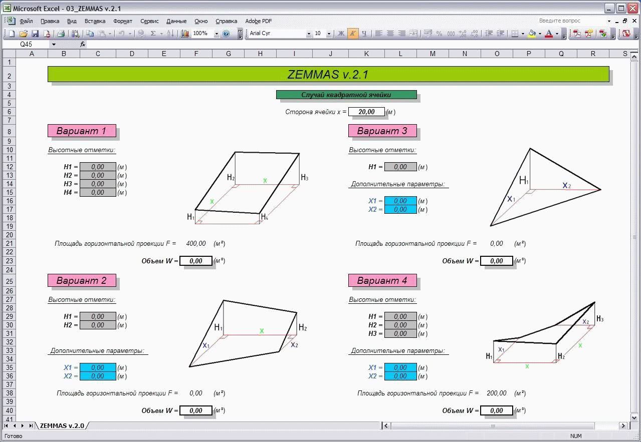 Например, формула: P = P1 + P2 + P3 + P4, где P – длина (или сумма длин показателей) верхушки, подсчитывает габариты криволинейных траншей целиком, используя данные отрезков разного направления по верху углубления. Рассматриваемое Р всегда представлено как: Р = Р1 или Р = Р2 и т.д.