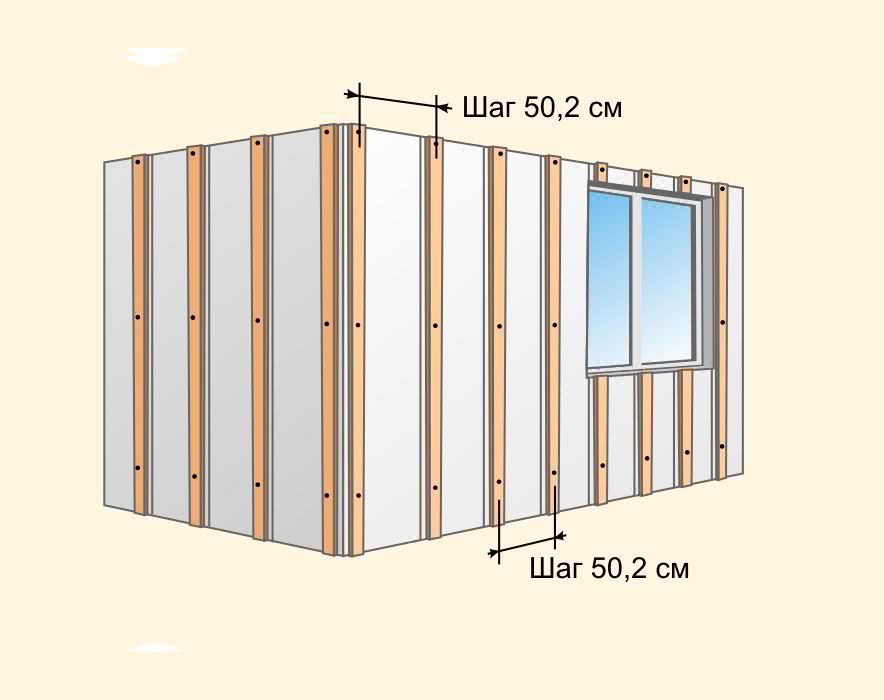 Шаг 1. Укладываем парозащитную плёнку и крепим обрешетку под панели с шагом в 30-40 см оцинкованными саморезами. Оконные и дверные проемы обустраиваем сплошной обрешеткой. Бруски крепим в зонах монтажа отделки, на стыках и в угловых зонах.