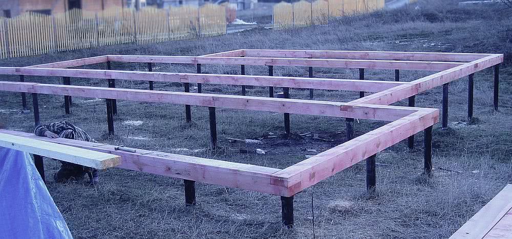 - Затем на обвязку из древесины монтируют лежень размера приблизительно 50х150 см, который закрепляют на оголовках посредством надежных болтов.