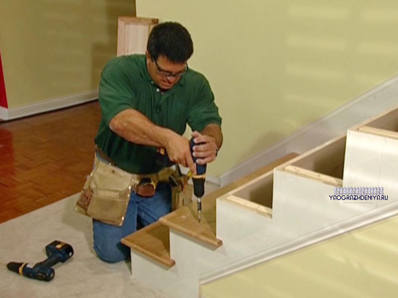 - Вкручивают саморезы в местах, где будут стоять столбики (на крайних ступенях сверху и снизу);