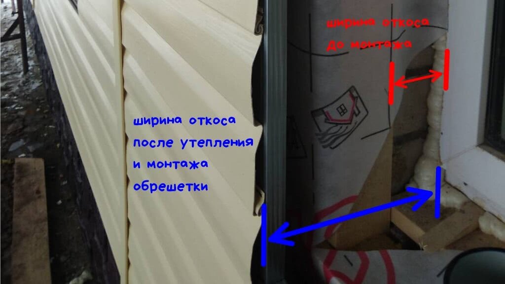 Часто измеряют расстояние от окна до края стены, но это неправильно, т.к. обязательно будет крепиться обрешетка, которая увеличит ширину откоса.
