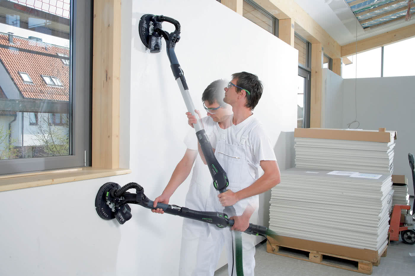 Безусловно, имея шлифовальную машину, полировка стен производится гораздо быстрее и проще. Она способна обеспечить идеальное качество поверхности и, самое главное, втягивает пыль. У многих моделей специальный эргономичный дизайн держателей, от которого не устают руки, а некоторые шлифмашины телескопически выдвигаются и позволяют работать, стоя на полу, на удаленном участке стены или потолка.