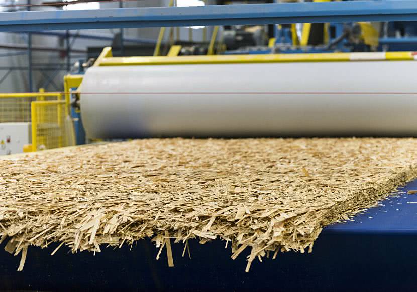 Щепа смешивается с клеящим составом и раскатывается в лист необходимой толщины. В качестве клеящего состава чаще всего применяются формальдегидные смолы. Существуют ОСП, в которых в качестве связующего выступает метилендифенилдиизоцианат, или МДИ. Плиты на его основе отличаются меньшей эмиссией формальдегида, но стоят дороже. На таких плитах ставится отметка «Green»