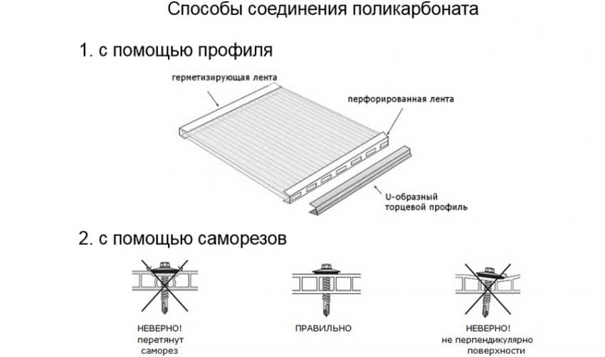 - Листы поликарбоната крепят к каркасу с использованием саморезов. Также рекомендуют применять шайбы-прокладки, не позволяющие материалу нагреваться.