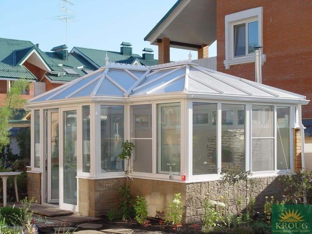- Холодное или теплое. В первом варианте ближе к зиме, температурный режим внутри помещения будет всего на пять или семь градусов выше, чем на улице, поэтому холодное остекление веранды на даче поликарбонатом применяется лишь для того, чтобы продлить осень. Второй вариант дарит возможность использовать пристройку круглый год.