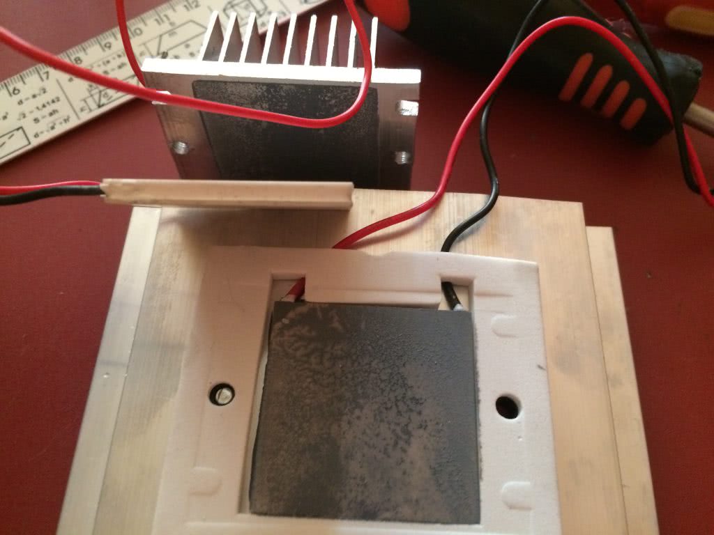 - В завершении оргстекло помещают на место старой двери, внизу под трубой располагают емкость для конденсатора.