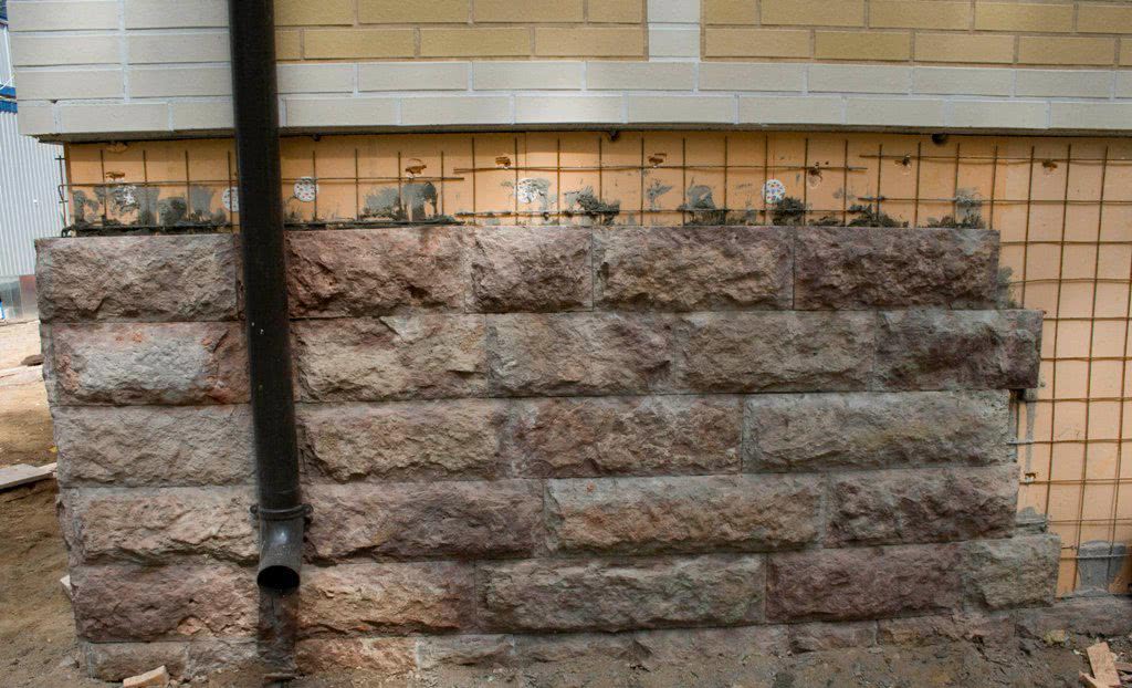 Застывание штукатурки нельзя ускорять принудительно (обдув, нагрев, ИК-излучатели). Основной слой штукатурки фундамента сохнет под укрывным пленочным материалом 2-3 недели (зависит от толщины) с регулярным смачиванием первые 4 дня. Только после полного высыхания начинается облицовка цоколя. Толщина будет зависеть от глубины прорезки рельефа и колеблется от 0,5-1 см (для неглубоких оттисков) до 2-3 см (правдоподобная, объемная кладка).