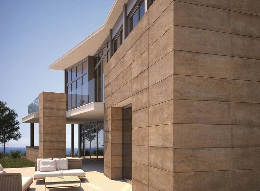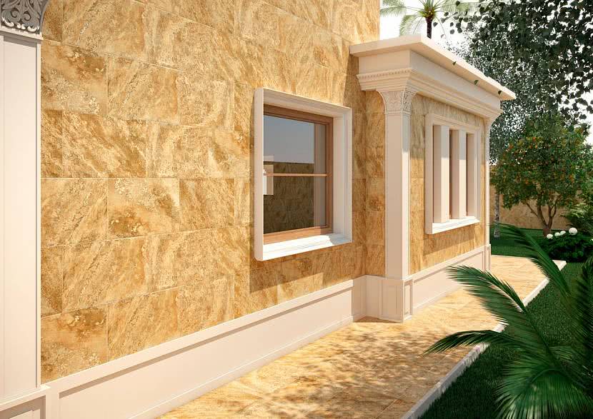 Керамогранит производят из крошки керамзита и гранита, сверху покрывают глазурью. Плиты выпускают в виде крупных элементов для облицовки фасадов. Материал встречается как классический гладкий, так и под дикий камень. В загородных домах часто используют сочетание разных фактур. Стены отделывают глянцевым сырьем, а участки фундамента – рельефным.