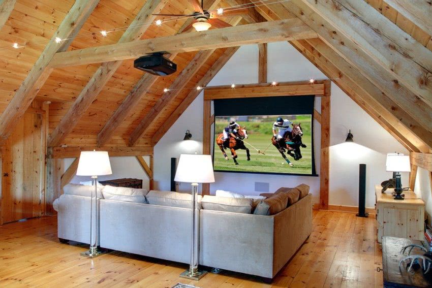 В мансарду при желании можно превратить даже обычный чердак с крутыми скатами, достающими до самых перекрытий. Для этого будет достаточно соорудить невысокие стены по обеим сторонам. В этом случае оригинальным и практичным решением будет врезка потолочных окон и декорирование несущих балок стропильной системы.