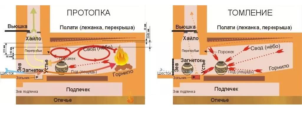 Пища в русской печи готовится без прямого контакта с огнем. Уникальный вкус блюд русской кухни получается за счет длительного томления под воздействием теплового ИК-излучения стен прогретого горнила. При таком способе в продуктах не образуются вредные продукты распада. Температурный режим приготовления различных блюд регулируется с помощью длинного ухвата. Подвигая чугунные или глиняные горшки ближе к устью или глубже в горнило, хозяйка меняет силу нагревания в диапазоне 150-350оС.