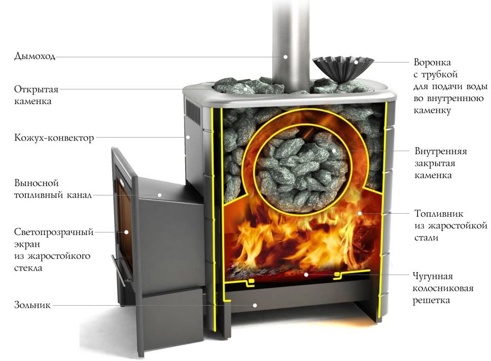 Конструктивный элемент печки, предназначенный для сгорания топлива. Многие любители парной убеждены, что лучшая дровяная печь для бани та, которая имеет дверку топки из огнеупорного стекла. Почему, мы уже говорили выше.