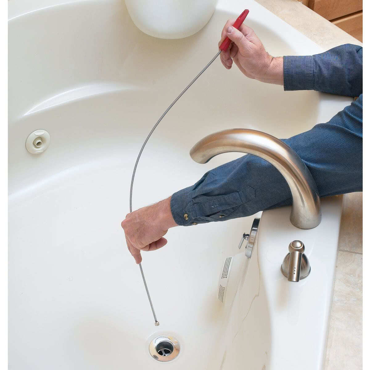 Использование троса не рекомендуется, если у вас установлены пластиковые трубы. Вставьте трос в сливное отверстие и толкайте его, вращая вокруг оси, пока не достигните засора. Желательно, чтобы он зацепился за крюк на тросе, и вы его достали. После этого, промойте слив горячей водой.