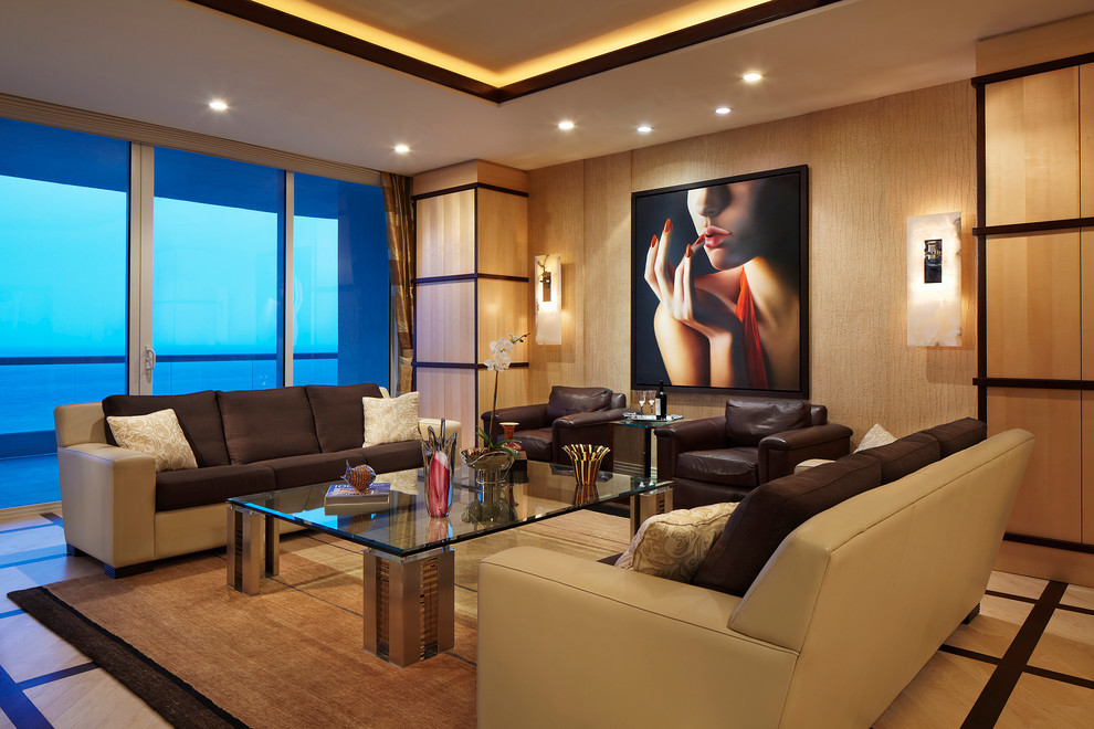 - В гостиную рекомендуется устанавливать матовые потолки. Они смягчают яркий свет и создают уютную обстановку.