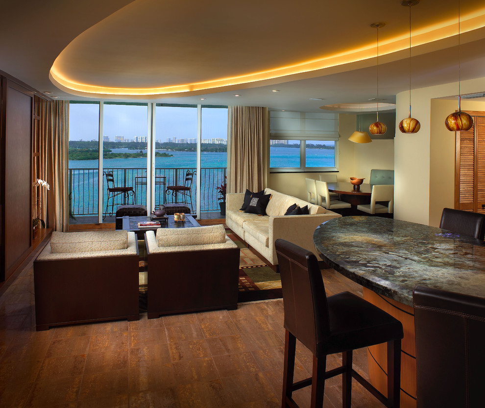 Ко второму виду парящих потолков относится дизайнерское решение, подразумевающее скрытые подсветки. В данном случае приборы освещения устанавливаются в нишах между уровнями, а свет от приборов направляется не в комнату, а на другие поверхности.