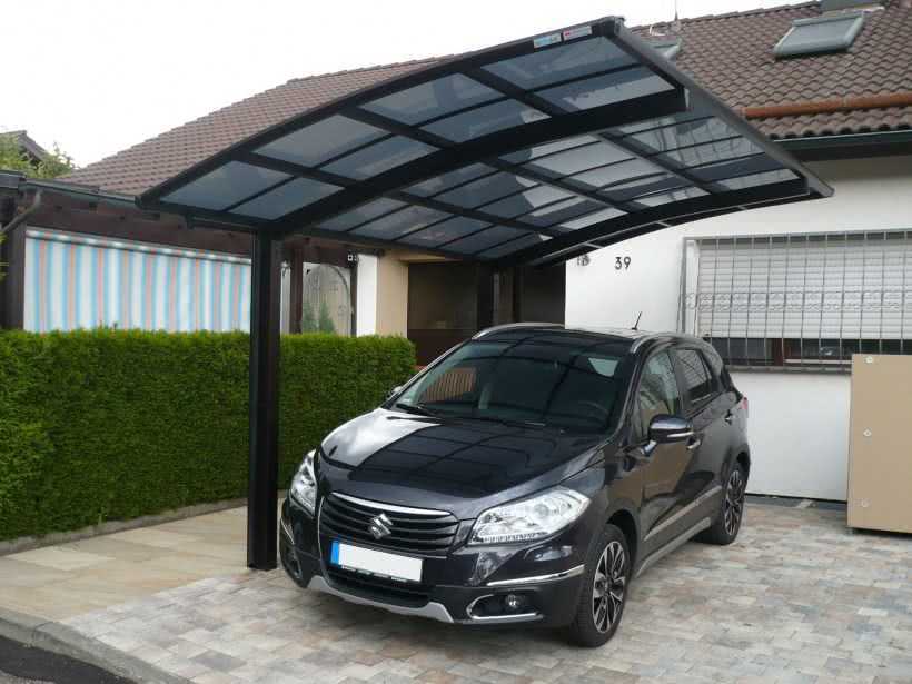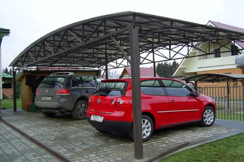 В том случае, когда площадка располагается отдельно, для навеса потребуется возвести капитальную арку. Помните, что слишком большая высота не способствует устойчивости конструкции, которую будет трясти ветер, а косые струи дождя попадать на машину. Оптимальным ростом подобного навеса может считаться 2,3-2,5 м.