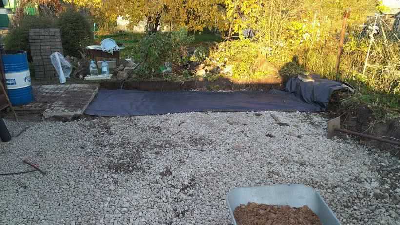 Дальше нужно насыпать внутри будущей площадки гравий средней фракции толщиной около 15 см и слегка утрамбовать его с таким расчетом, чтобы насыпь получилась на несколько сантиметров выше окружающего грунта.