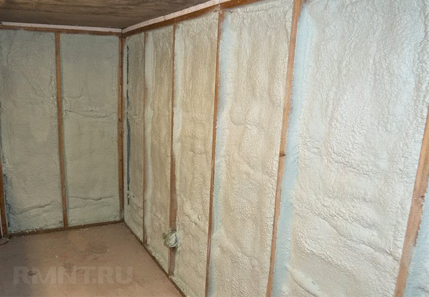 Утепление ППУ удовлетворяет всем требованиям по пароизоляции, водопоглощению и отсутствию швов. Поэтому, даже если внутри слоя окажется точка росы, она так и останется «условной», так как выпадение конденсата в паронепроницаемых материалах отсутствует. Получается со стороны помещения полностью герметичный теплоизоляционный слой.