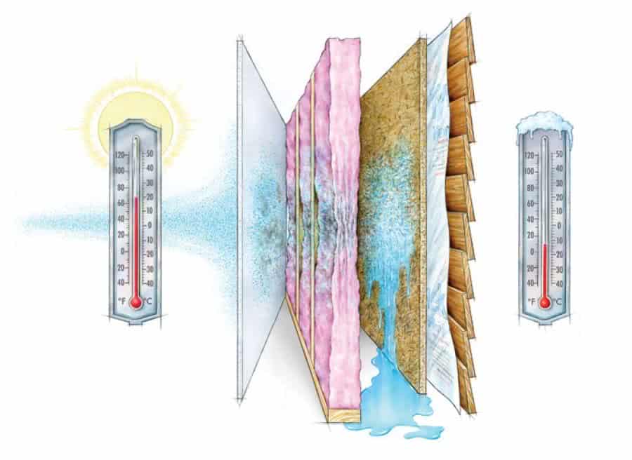 Пар легко попадает в стену или крышу и «проскакивает» утеплитель, который как правило имеет превосходное паропроницание. Но затем он «упирается» в наружный материал с плохим проницанием, и в итоге, точка росы образуется внутри стены, прямо перед препятствием на пути пара.