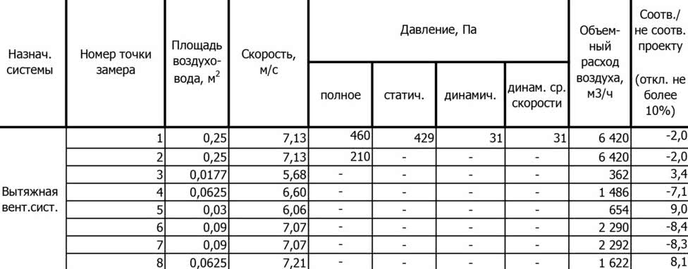 В разделе «В» указывают расходы воздуха в каждом помещении. В таблице перечисляют все помещения, которые охватывает вентиляционная система, номера мерных сечений, проектный и фактический расход воздуха в м3/ч и невязку, которая представляет собой процент отклонения фактических значений расхода воздуха от проектных.