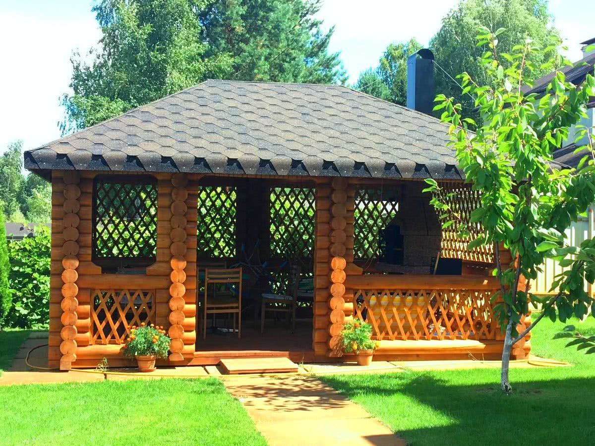 Русский стиль предусматривает бревенчатую или резную конструкцию. Беседка из бревна выполняется наподобие русской хаты, а резьба отсылает к оформлению купеческих домов.
