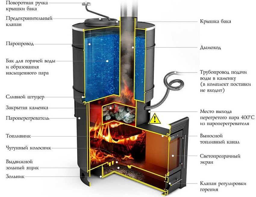 Основное назначение печки для бани на дровах с баком для воды – хорошо прогревать парную и удерживать приемлемую температуру помещения длительное время. Чтобы получить максимальный результат, конструкция оснащается следующими элементами: