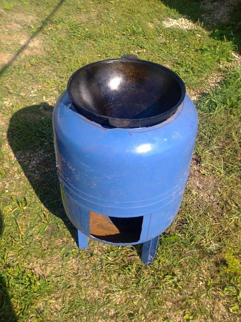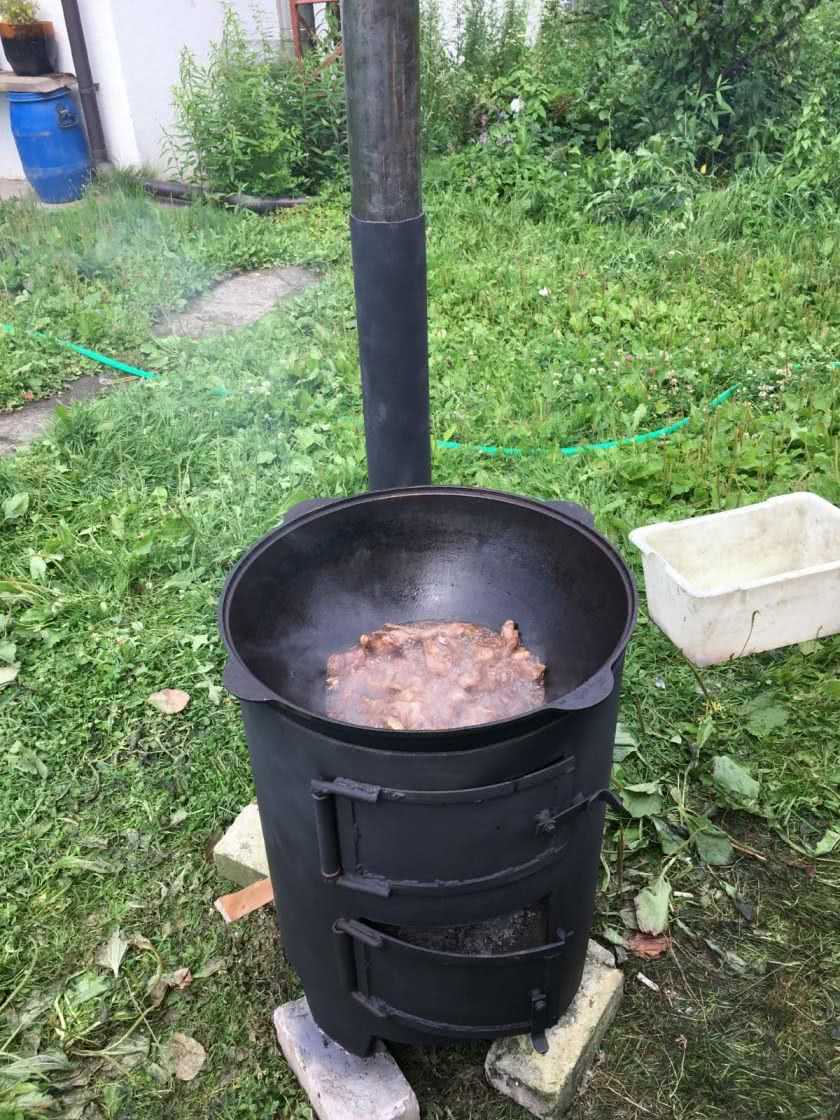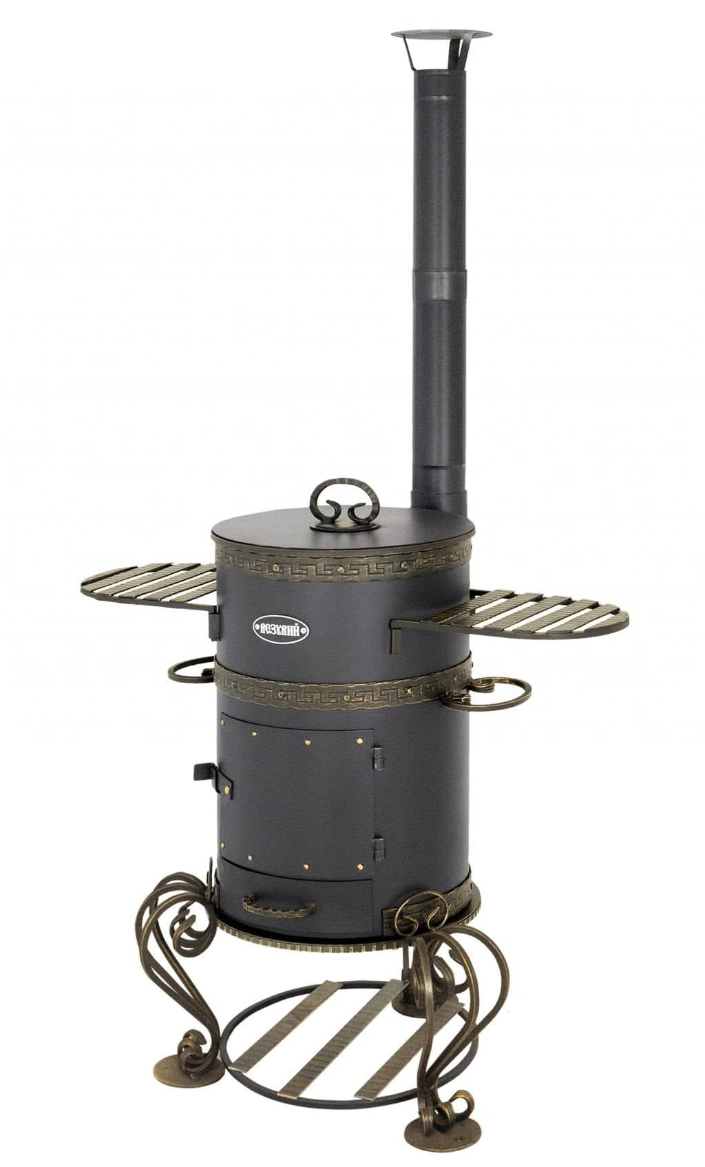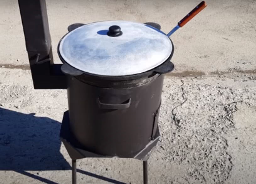 Печь, на которую ставится, казан, напоминает металлический цилиндр. Опорой ему служат массивные ножки. Внизу сделано дно, верхняя часть отсутствует. Если возникнет особое желание, ее можно оборудовать дымоходом, но это совсем необязательно. В таких печах делаются специальные вырезы верху цилиндра. Они играют роль дымоотвода.