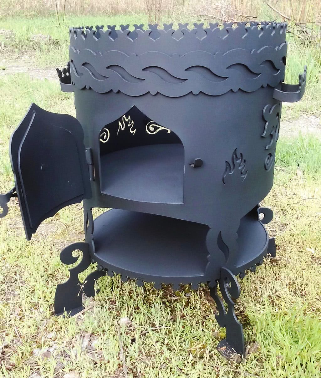 Печь, предназначенная для приготовления кулинарных изысков в казане со стороны, напоминает цилиндр. В качестве опоры для основы должны быть массивные ножки, чтобы они могли выдержать массу казанка с едой в нем.