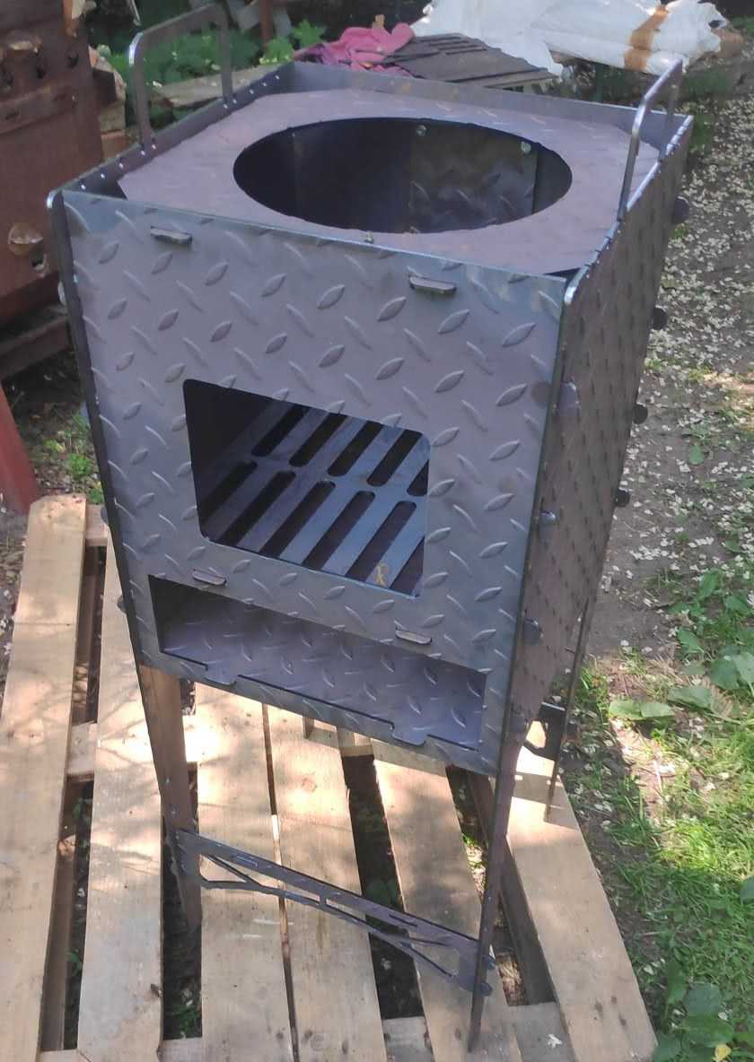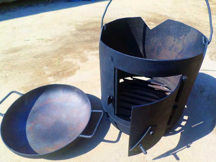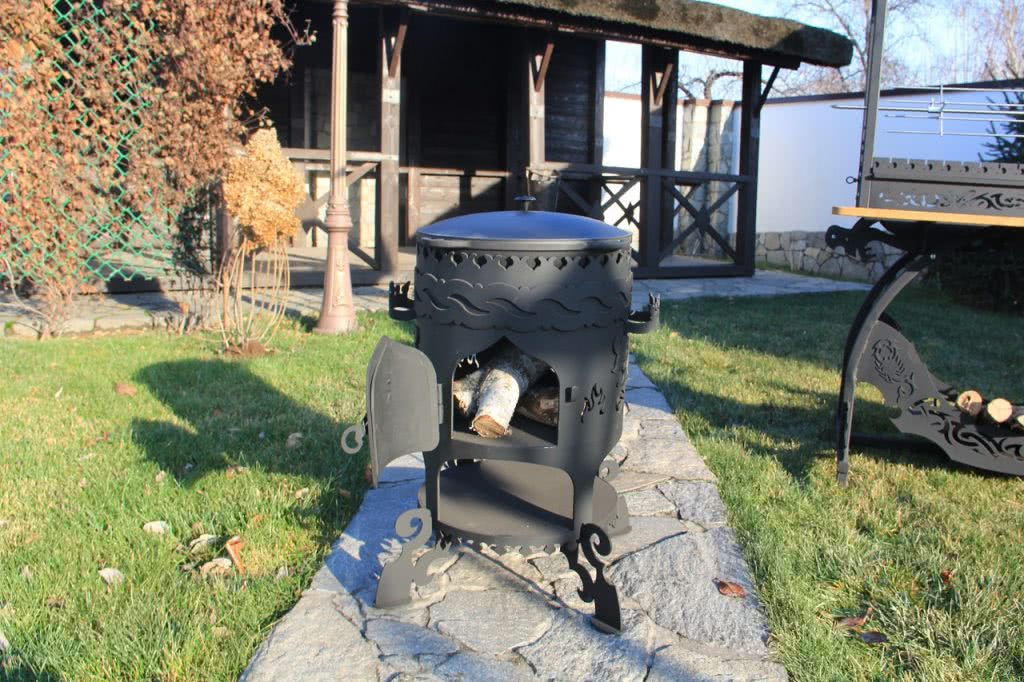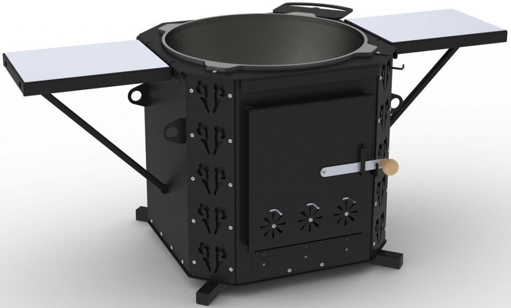 Оптимальной конструкцией, для работы с казаном, будет специальная система, оборудованная съемными ножками. Достаточно большая площадь позволяет устанавливать посуду, готовить прямо на приусадебном участке. Транспортировать печь в любое место, благодаря разборной конструкции. С наступлением холодов ее можно будет увезти домой.