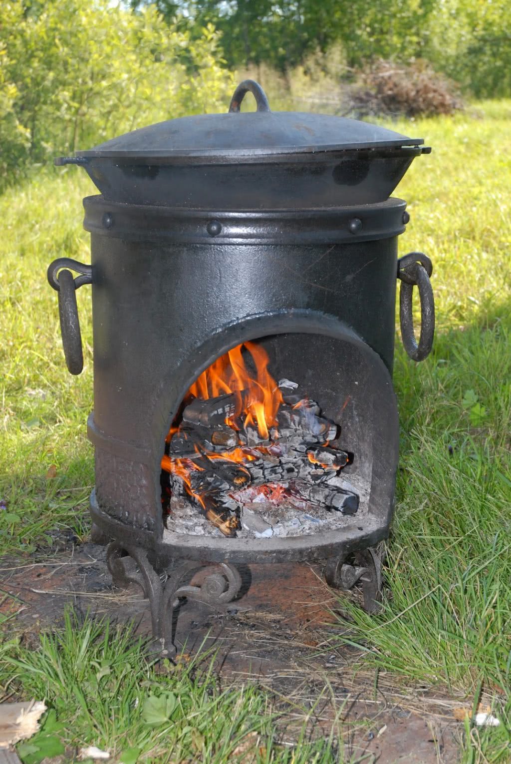 При приготовлении еды на такой печи происходит экономное расходование тепловой энергии, ведь пламя надежно защищено от ветра. В такой печи прогрев котла происходит в разы скорее, нежели на открытом костре.